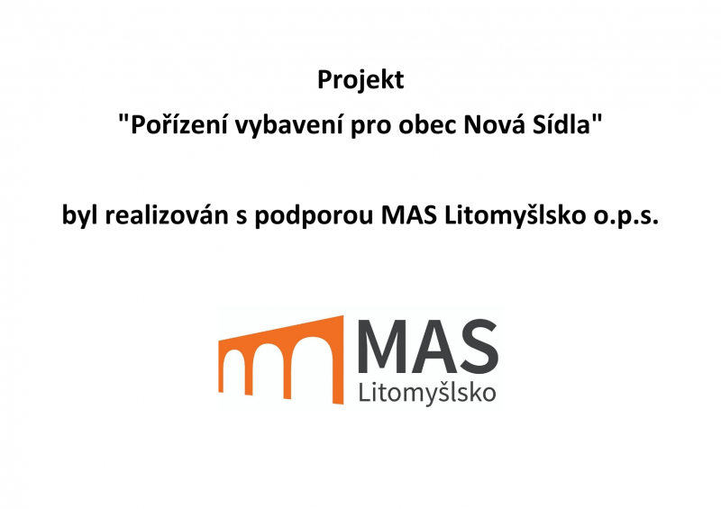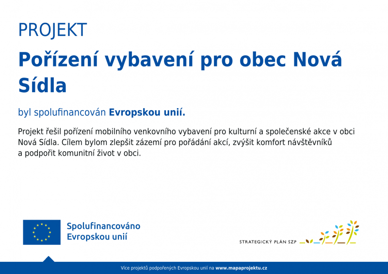 Obec Nová Sídla úspěšně realizovala projekt „Pořízení vybavení pro obec Nová Sídla“, jehož cílem je pořízení nového vybavení pro kulturní a spolkovou činnost obce. V rámci projektu byly zakoupeny dva nůžkové party stany, jeden okap k party stanům, šest pivních setů s opěradly, šest pivních setů s opěradly, dále grilovací trojnožka s roštem a zahradní ohniště s držadly a stabilními nohami. Díky tomuto vybavení bude obec moci lépe pořádat společenské akce, zlepšit komfort pro účastníky a podpořit aktivní zapojení spolkových a kulturních aktivit.